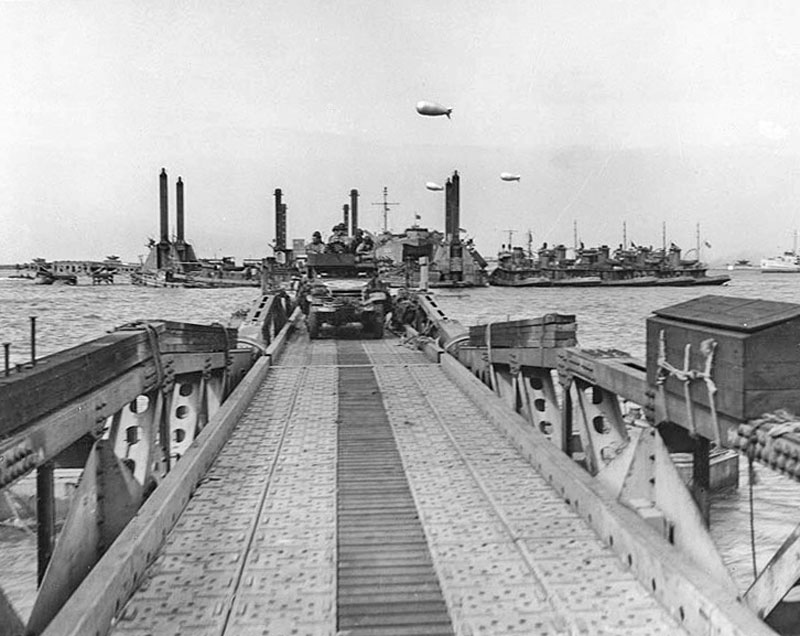 Vehicles landing from a 'Mulberry Harbour' at Omaha Beach.
