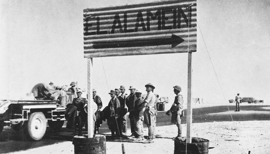 German prisoners of war under guard by a signpost to El Alamein, 1942.