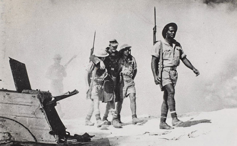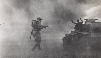 A British infantryman capturing a German tank crewman at El Alamein, 1942.