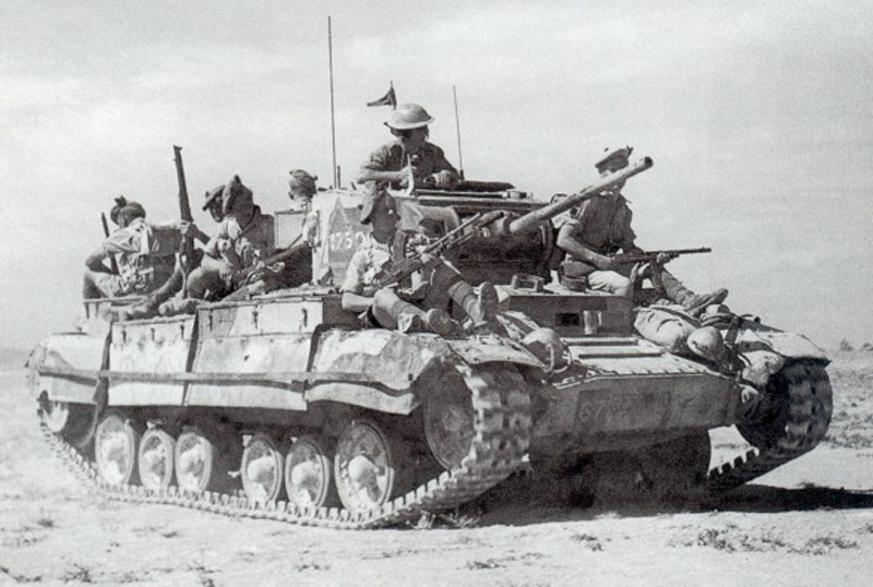 A Valentine Mk 3 in North Africa carrying infantry from a Scottish regiment.