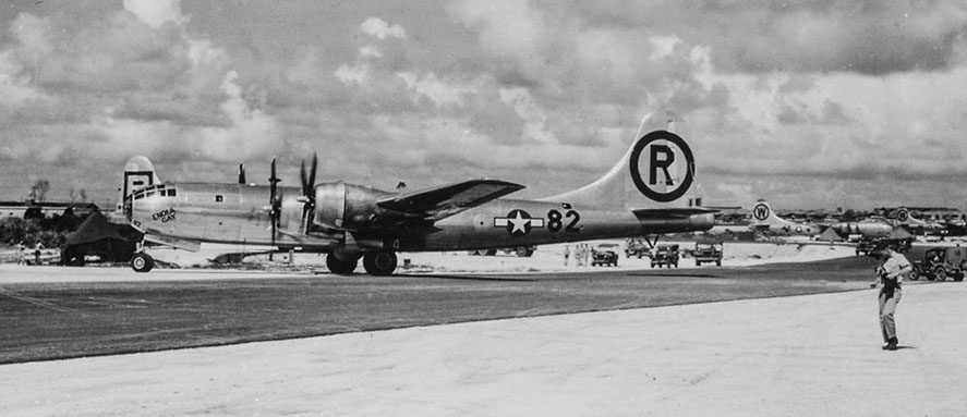 Enola Gay after Hiroshima mission, entering hard stand. It is in its 6th Bombardment Group livery,