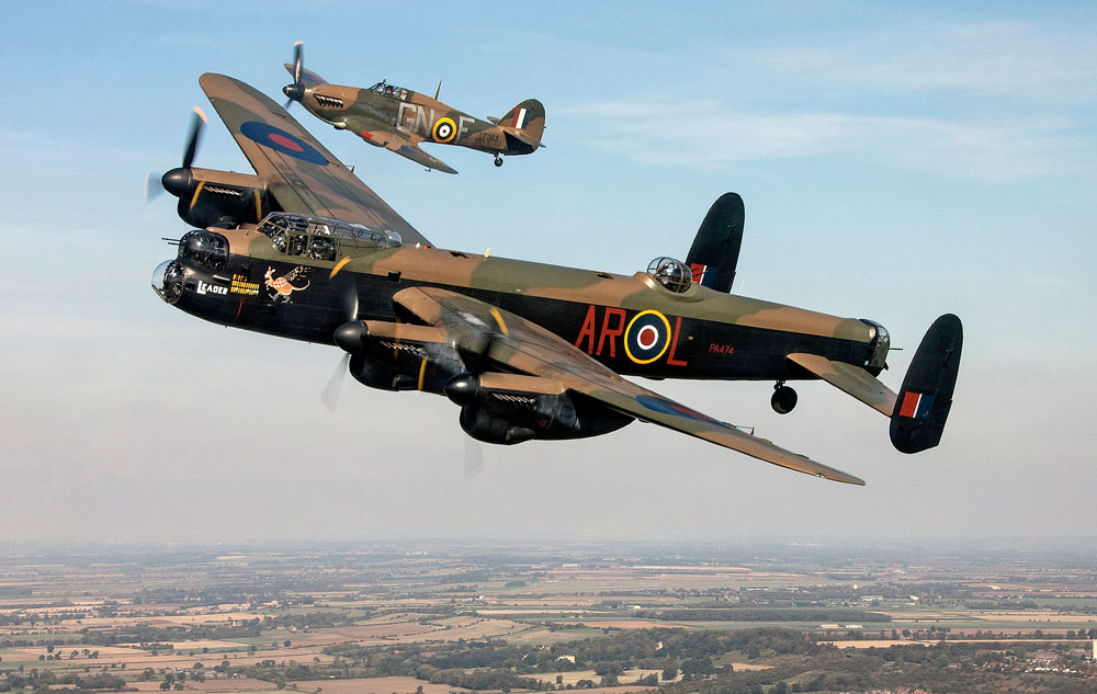 Avro Lancaster and Hawker Hurricane from the Battle of Britain Memorial Flight (BBMF) in the skies above Lincolnshire.