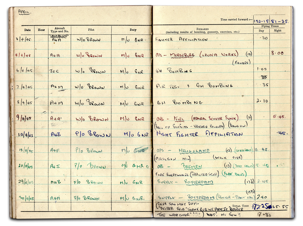 Pages from a Lancaster Mid Gunner's log book. He flew with 195 Squadron.