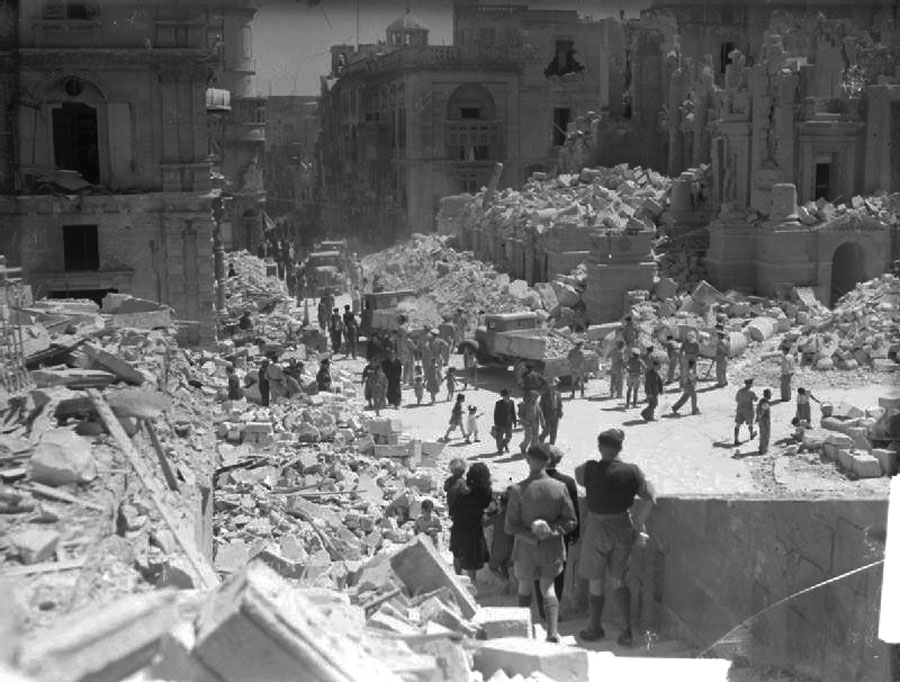 the main street in Valetta. Service personnel and civilians are present clearing up the debris.