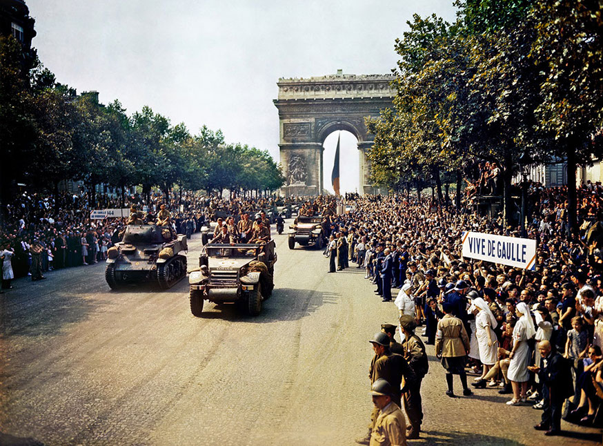 Parisians line the Champs Élysées for a parade conducted by the French 2nd Armoured Division on 26 August 1944