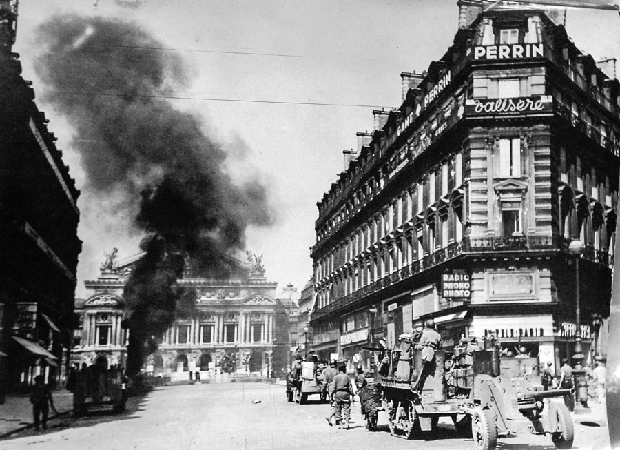 Armoured vehicles of the 2nd Armoured (Leclerc) Division fighting before the Palais Garnier.
