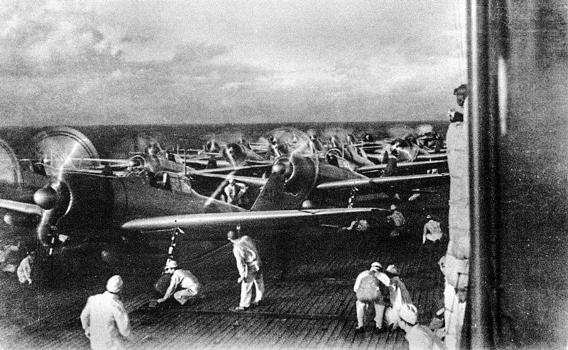 A6M2 Zero fighters prepare to launch from Akagi as part of the second wave during the attack on Pearl Harbor