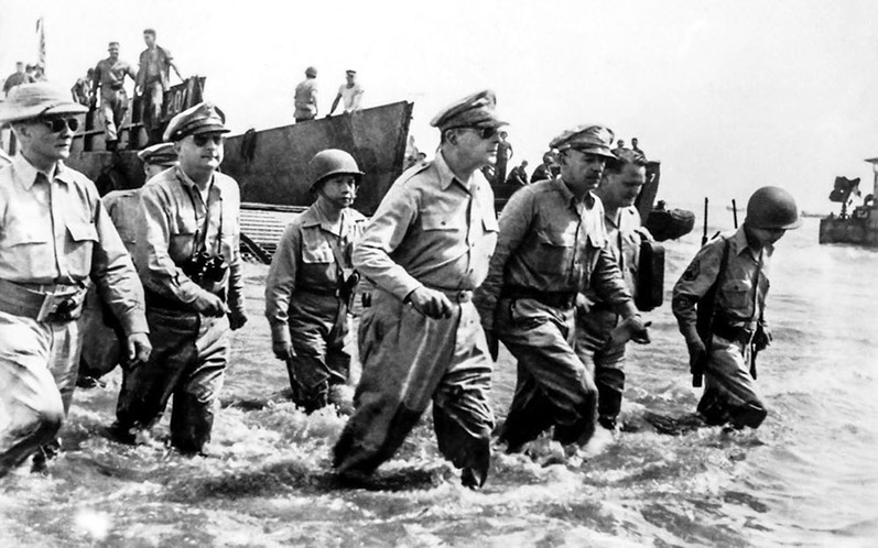 General Douglas MacArthur, President Osmeña, and staff land at Palo, Leyte on October 20, 1944.