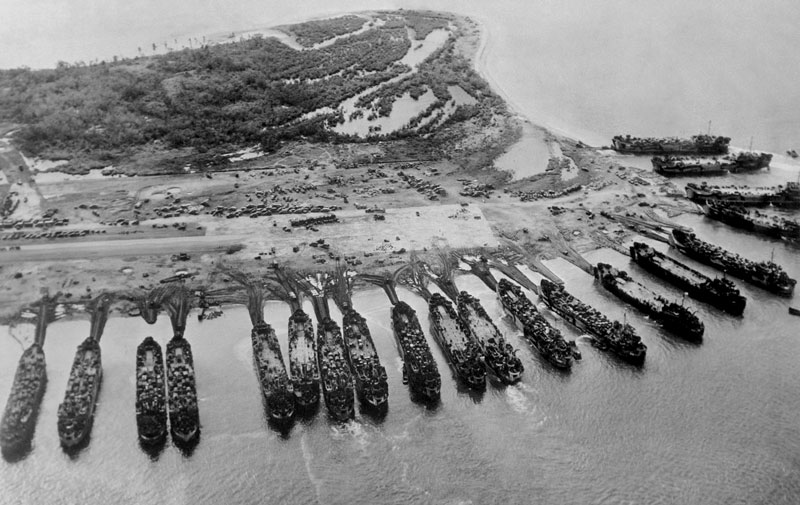 U.S. LST's (Tank Landing Ships) moored near Tacloban, Leyte Island, shortly after the invasion. They brought equipment and material to lay down a steel matting runway.