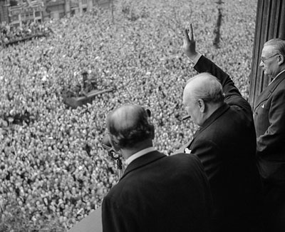 Winston Churchill waves to crowds in Whitehall in London as they celebrate VE Day.