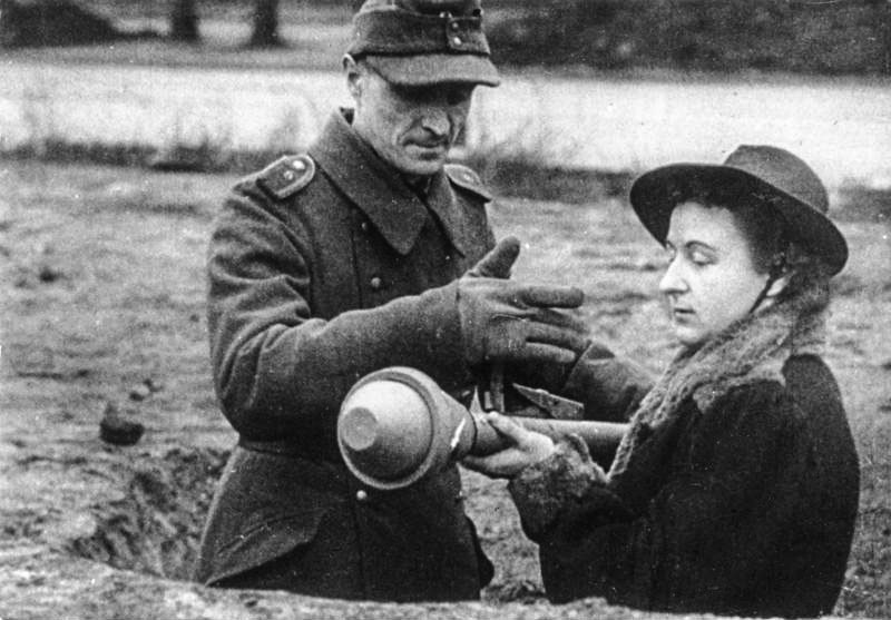 A Volkssturm trooper explaining the handling of a Panzerfaust to a female civilian.